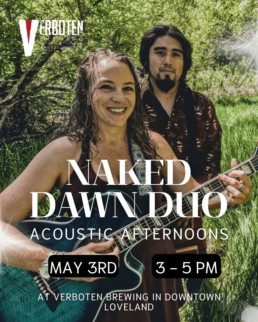 Acoustic Afternoons: Naked Dawn DuoAcoustic Afternoons at Verboten Brewing!!With special guests: Naked Dawn DuoWhen: Sunday, May 3rdTime: 3 – 5 PMCome grab a beer and listen to some tunes with us!+ Add to Google Calendar+ iCal / Outlook export 00days 00hours 00minutes 00seconds Tags: acoustic afternoons, beer4all, colorado craft beer, Downtown Loveland, Forbidden Beer, live music, loveland events, music and beer, Verboten Brewing DateMay 03 2026 Time 3:00 pm - 5:00 pm LocationVerboten Brewing & Barrel Project127 E. 5th St, Loveland, CO 80537 Category Live MusicShare this event