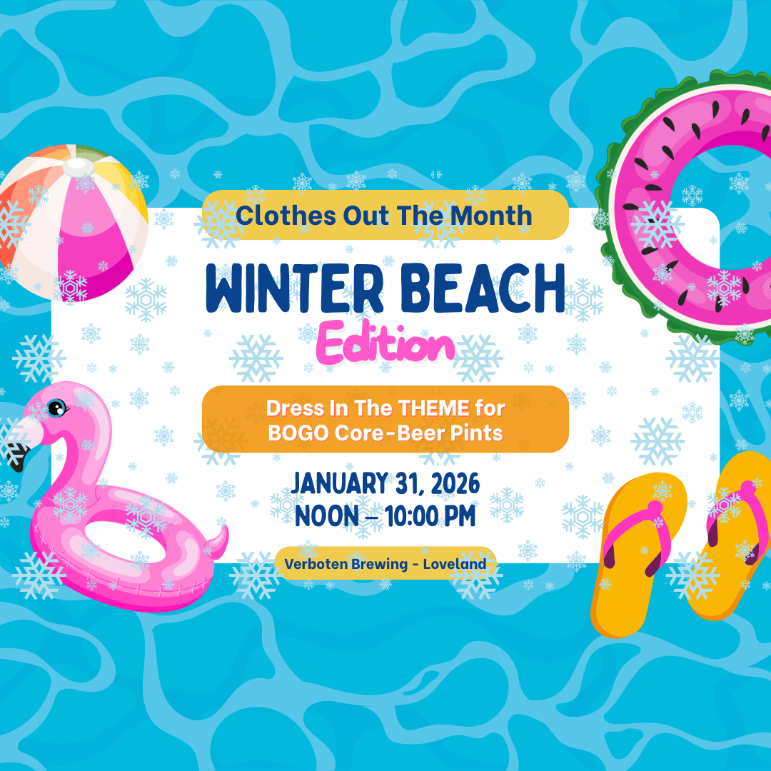 Join our Loveland Taproom on the last day of every month for “Clothes Out The Month” – a day dedicated to dressing in a rotation of random themes. This month, we’re pretending we’re at the beach…in the middle of winter. Join our beertenders in dressing up! Think:Flip-flops + socks